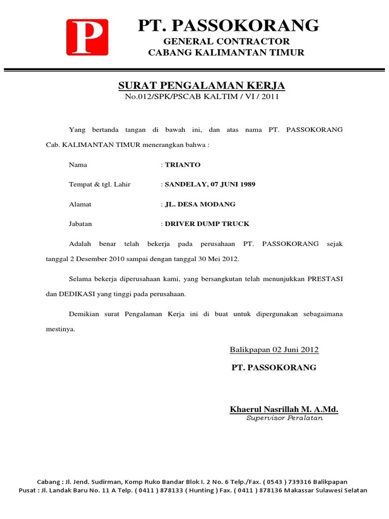 Passokorang general contractor cabang kalimantan timur surat pengalaman kerja.