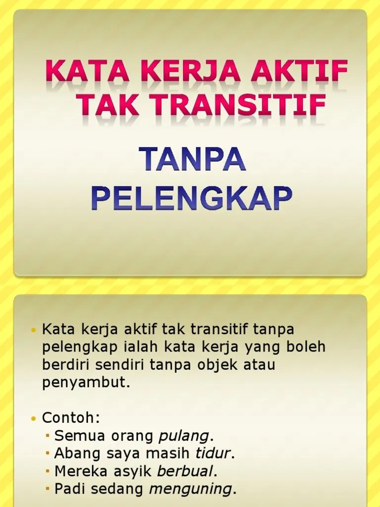 Tatabahasa interactive exercise for tingkatan 1,2,3. Download latihan kata kerja aktif tak transitif pdf. Title, latihan kata kerja aktif tak transitif. Tidak memerlukan objek atau penyambut. Latihan bahasa melayu kata kerja tak transitif latihan bahasa melayu kata kerja transitif.